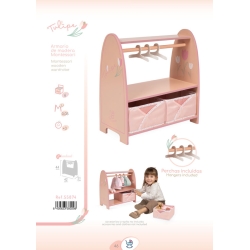 Include: 1 armadio in legno Montessori per bambole con serigrafia del design speciale della linea Tulipe rosa, due cassetti estraibili in tessuto, tre grucce in legno e tanti altri dettagli di lusso.