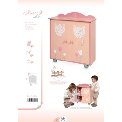 Include: 1 armadio in legno per bambole con serigrafia del design speciale della linea Tulipe rosa, due porte a battente, tre grucce in legno e tanti altri dettagli di lusso.