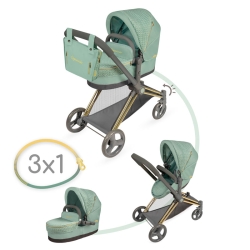 Include: 1 carro di bambole Capriccio verde e nero con design 3 in 1 convertibile in seggiolino e culla, struttura pieghevole, ruote anteriori girevoli, cintura di sicurezza stile imbragatura, vassoio inferiore portaoggetti, tessuto imbottito e liscio combinato, parte della struttura cromata, borsa abbinata e altri dettagli di lusso.
