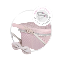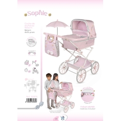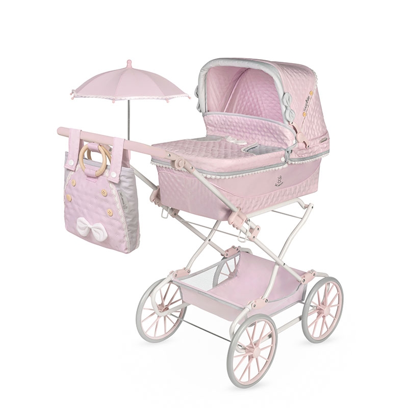 Include: 1 carro per bambole della linea Sophie di colore rosa con dettagli bianchi e grigi, struttura pieghevole, maniglione con altezza regolabile, sospensioni, fiocchi imbottiti, dettagli ricamati, bottoni decorativi in legno naturale, borsa coordinata con manici in legno naturale, ombrellino, grandi ruote con rivestimento in schiuma, tessuto imbottito, vassoio portaoggetti, cappottina con tenditori, materassino, copertina, copertura con piccola tasca e molti altri dettagli di lusso.