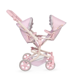 Include: 1 carro gemellare della linea Sophie di colore rosa con dettagli grigi, struttura pieghevole multiposizione, tessuto imbottito, manico con altezza regolabile, fiocchi imbottiti, dettagli ricamati, bottoni decorativi in legno naturale, ruote anteriori girevoli, borsa coordinata con manici in legno naturale, ruote con copertura in schiuma, vassoio portaoggetti in tessuto, cinture di sicurezza e tanti altri dettagli di lusso.