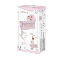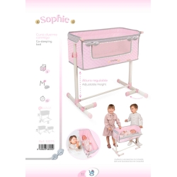 1 culla per bambole Duerme Conmigo della collezione Sophie di colore rosa con dettagli grigi, struttura con altezza regolabile, tessuto imbottito, fiocchi imbottiti, bottoni decorativi in legno, dettagli ricamati e molti altri dettagli di lusso.